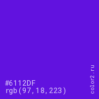 Цвет #6112DF в цветовой модели RGB обозначается тремя октетами (97, 18, 223) в десятичном формате и #6112DF в шестнадцатиричном (hex) формате, которые являются интенсивностью красного 97 (hex 61), интенсивность зелёного 18 (hex 12) и интенсивность синего 223 (hex DF).