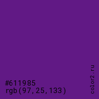 Цвет #611985 в цветовой модели RGB обозначается тремя октетами (97, 25, 133) в десятичном формате и #611985 в шестнадцатиричном (hex) формате, которые являются интенсивностью красного 97 (hex 61), интенсивность зелёного 25 (hex 19) и интенсивность синего 133 (hex 85).
