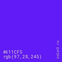 Цвет #611CF5 в цветовой модели RGB обозначается тремя октетами (97, 28, 245) в десятичном формате и #611CF5 в шестнадцатиричном (hex) формате, которые являются интенсивностью красного 97 (hex 61), интенсивность зелёного 28 (hex 1C) и интенсивность синего 245 (hex F5).