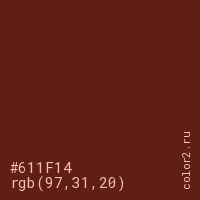 Цвет #611F14 в цветовой модели RGB обозначается тремя октетами (97, 31, 20) в десятичном формате и #611F14 в шестнадцатиричном (hex) формате, которые являются интенсивностью красного 97 (hex 61), интенсивность зелёного 31 (hex 1F) и интенсивность синего 20 (hex 14).