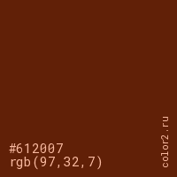 Цвет #612007 в цветовой модели RGB обозначается тремя октетами (97, 32, 7) в десятичном формате и #612007 в шестнадцатиричном (hex) формате, которые являются интенсивностью красного 97 (hex 61), интенсивность зелёного 32 (hex 20) и интенсивность синего 7 (hex 07).