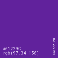 Цвет #61229C в цветовой модели RGB обозначается тремя октетами (97, 34, 156) в десятичном формате и #61229C в шестнадцатиричном (hex) формате, которые являются интенсивностью красного 97 (hex 61), интенсивность зелёного 34 (hex 22) и интенсивность синего 156 (hex 9C).