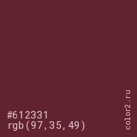 Цвет #612331 в цветовой модели RGB обозначается тремя октетами (97, 35, 49) в десятичном формате и #612331 в шестнадцатиричном (hex) формате, которые являются интенсивностью красного 97 (hex 61), интенсивность зелёного 35 (hex 23) и интенсивность синего 49 (hex 31).