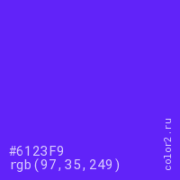 Цвет #6123F9 в цветовой модели RGB обозначается тремя октетами (97, 35, 249) в десятичном формате и #6123F9 в шестнадцатиричном (hex) формате, которые являются интенсивностью красного 97 (hex 61), интенсивность зелёного 35 (hex 23) и интенсивность синего 249 (hex F9).