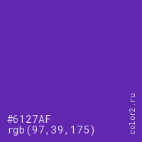 Цвет #6127AF в цветовой модели RGB обозначается тремя октетами (97, 39, 175) в десятичном формате и #6127AF в шестнадцатиричном (hex) формате, которые являются интенсивностью красного 97 (hex 61), интенсивность зелёного 39 (hex 27) и интенсивность синего 175 (hex AF).