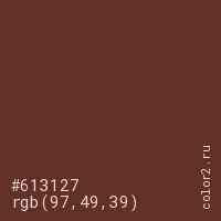 Цвет #613127 в цветовой модели RGB обозначается тремя октетами (97, 49, 39) в десятичном формате и #613127 в шестнадцатиричном (hex) формате, которые являются интенсивностью красного 97 (hex 61), интенсивность зелёного 49 (hex 31) и интенсивность синего 39 (hex 27).