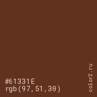 Цвет #61331E в цветовой модели RGB обозначается тремя октетами (97, 51, 30) в десятичном формате и #61331E в шестнадцатиричном (hex) формате, которые являются интенсивностью красного 97 (hex 61), интенсивность зелёного 51 (hex 33) и интенсивность синего 30 (hex 1E).