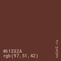 Цвет #61332A в цветовой модели RGB обозначается тремя октетами (97, 51, 42) в десятичном формате и #61332A в шестнадцатиричном (hex) формате, которые являются интенсивностью красного 97 (hex 61), интенсивность зелёного 51 (hex 33) и интенсивность синего 42 (hex 2A).