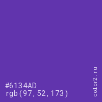 Цвет #6134AD в цветовой модели RGB обозначается тремя октетами (97, 52, 173) в десятичном формате и #6134AD в шестнадцатиричном (hex) формате, которые являются интенсивностью красного 97 (hex 61), интенсивность зелёного 52 (hex 34) и интенсивность синего 173 (hex AD).