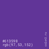 Цвет #613598 в цветовой модели RGB обозначается тремя октетами (97, 53, 152) в десятичном формате и #613598 в шестнадцатиричном (hex) формате, которые являются интенсивностью красного 97 (hex 61), интенсивность зелёного 53 (hex 35) и интенсивность синего 152 (hex 98).