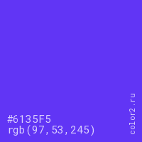 Цвет #6135F5 в цветовой модели RGB обозначается тремя октетами (97, 53, 245) в десятичном формате и #6135F5 в шестнадцатиричном (hex) формате, которые являются интенсивностью красного 97 (hex 61), интенсивность зелёного 53 (hex 35) и интенсивность синего 245 (hex F5).