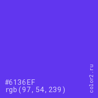 Цвет #6136EF в цветовой модели RGB обозначается тремя октетами (97, 54, 239) в десятичном формате и #6136EF в шестнадцатиричном (hex) формате, которые являются интенсивностью красного 97 (hex 61), интенсивность зелёного 54 (hex 36) и интенсивность синего 239 (hex EF).