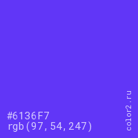 Цвет #6136F7 в цветовой модели RGB обозначается тремя октетами (97, 54, 247) в десятичном формате и #6136F7 в шестнадцатиричном (hex) формате, которые являются интенсивностью красного 97 (hex 61), интенсивность зелёного 54 (hex 36) и интенсивность синего 247 (hex F7).
