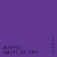 Цвет #613792 в цветовой модели RGB обозначается тремя октетами (97, 55, 146) в десятичном формате и #613792 в шестнадцатиричном (hex) формате, которые являются интенсивностью красного 97 (hex 61), интенсивность зелёного 55 (hex 37) и интенсивность синего 146 (hex 92).