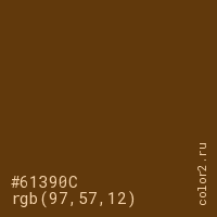 Цвет #61390C в цветовой модели RGB обозначается тремя октетами (97, 57, 12) в десятичном формате и #61390C в шестнадцатиричном (hex) формате, которые являются интенсивностью красного 97 (hex 61), интенсивность зелёного 57 (hex 39) и интенсивность синего 12 (hex 0C).