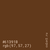 Цвет #61391B в цветовой модели RGB обозначается тремя октетами (97, 57, 27) в десятичном формате и #61391B в шестнадцатиричном (hex) формате, которые являются интенсивностью красного 97 (hex 61), интенсивность зелёного 57 (hex 39) и интенсивность синего 27 (hex 1B).