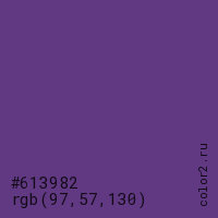 Цвет #613982 в цветовой модели RGB обозначается тремя октетами (97, 57, 130) в десятичном формате и #613982 в шестнадцатиричном (hex) формате, которые являются интенсивностью красного 97 (hex 61), интенсивность зелёного 57 (hex 39) и интенсивность синего 130 (hex 82).