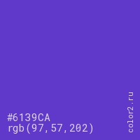 Цвет #6139CA в цветовой модели RGB обозначается тремя октетами (97, 57, 202) в десятичном формате и #6139CA в шестнадцатиричном (hex) формате, которые являются интенсивностью красного 97 (hex 61), интенсивность зелёного 57 (hex 39) и интенсивность синего 202 (hex CA).