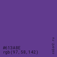Цвет #613A8E в цветовой модели RGB обозначается тремя октетами (97, 58, 142) в десятичном формате и #613A8E в шестнадцатиричном (hex) формате, которые являются интенсивностью красного 97 (hex 61), интенсивность зелёного 58 (hex 3A) и интенсивность синего 142 (hex 8E).