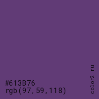 Цвет #613B76 в цветовой модели RGB обозначается тремя октетами (97, 59, 118) в десятичном формате и #613B76 в шестнадцатиричном (hex) формате, которые являются интенсивностью красного 97 (hex 61), интенсивность зелёного 59 (hex 3B) и интенсивность синего 118 (hex 76).