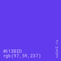 Цвет #613BED в цветовой модели RGB обозначается тремя октетами (97, 59, 237) в десятичном формате и #613BED в шестнадцатиричном (hex) формате, которые являются интенсивностью красного 97 (hex 61), интенсивность зелёного 59 (hex 3B) и интенсивность синего 237 (hex ED).