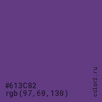 Цвет #613C82 в цветовой модели RGB обозначается тремя октетами (97, 60, 130) в десятичном формате и #613C82 в шестнадцатиричном (hex) формате, которые являются интенсивностью красного 97 (hex 61), интенсивность зелёного 60 (hex 3C) и интенсивность синего 130 (hex 82).
