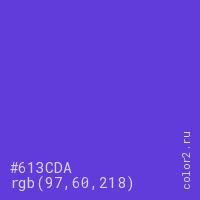 Цвет #613CDA в цветовой модели RGB обозначается тремя октетами (97, 60, 218) в десятичном формате и #613CDA в шестнадцатиричном (hex) формате, которые являются интенсивностью красного 97 (hex 61), интенсивность зелёного 60 (hex 3C) и интенсивность синего 218 (hex DA).