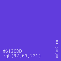Цвет #613CDD в цветовой модели RGB обозначается тремя октетами (97, 60, 221) в десятичном формате и #613CDD в шестнадцатиричном (hex) формате, которые являются интенсивностью красного 97 (hex 61), интенсивность зелёного 60 (hex 3C) и интенсивность синего 221 (hex DD).