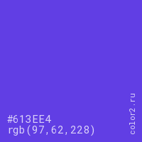 Цвет #613EE4 в цветовой модели RGB обозначается тремя октетами (97, 62, 228) в десятичном формате и #613EE4 в шестнадцатиричном (hex) формате, которые являются интенсивностью красного 97 (hex 61), интенсивность зелёного 62 (hex 3E) и интенсивность синего 228 (hex E4).
