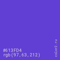 Цвет #613FD4 в цветовой модели RGB обозначается тремя октетами (97, 63, 212) в десятичном формате и #613FD4 в шестнадцатиричном (hex) формате, которые являются интенсивностью красного 97 (hex 61), интенсивность зелёного 63 (hex 3F) и интенсивность синего 212 (hex D4).