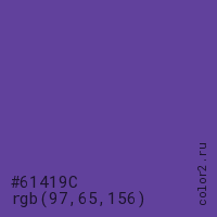 Цвет #61419C в цветовой модели RGB обозначается тремя октетами (97, 65, 156) в десятичном формате и #61419C в шестнадцатиричном (hex) формате, которые являются интенсивностью красного 97 (hex 61), интенсивность зелёного 65 (hex 41) и интенсивность синего 156 (hex 9C).