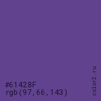 Цвет #61428F в цветовой модели RGB обозначается тремя октетами (97, 66, 143) в десятичном формате и #61428F в шестнадцатиричном (hex) формате, которые являются интенсивностью красного 97 (hex 61), интенсивность зелёного 66 (hex 42) и интенсивность синего 143 (hex 8F).