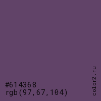 Цвет #614368 в цветовой модели RGB обозначается тремя октетами (97, 67, 104) в десятичном формате и #614368 в шестнадцатиричном (hex) формате, которые являются интенсивностью красного 97 (hex 61), интенсивность зелёного 67 (hex 43) и интенсивность синего 104 (hex 68).