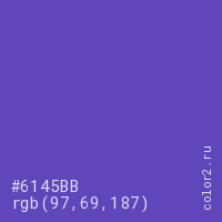 Цвет #6145BB в цветовой модели RGB обозначается тремя октетами (97, 69, 187) в десятичном формате и #6145BB в шестнадцатиричном (hex) формате, которые являются интенсивностью красного 97 (hex 61), интенсивность зелёного 69 (hex 45) и интенсивность синего 187 (hex BB).