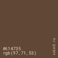 Цвет #614735 в цветовой модели RGB обозначается тремя октетами (97, 71, 53) в десятичном формате и #614735 в шестнадцатиричном (hex) формате, которые являются интенсивностью красного 97 (hex 61), интенсивность зелёного 71 (hex 47) и интенсивность синего 53 (hex 35).