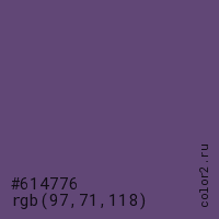 Цвет #614776 в цветовой модели RGB обозначается тремя октетами (97, 71, 118) в десятичном формате и #614776 в шестнадцатиричном (hex) формате, которые являются интенсивностью красного 97 (hex 61), интенсивность зелёного 71 (hex 47) и интенсивность синего 118 (hex 76).