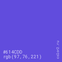 Цвет #614CDD в цветовой модели RGB обозначается тремя октетами (97, 76, 221) в десятичном формате и #614CDD в шестнадцатиричном (hex) формате, которые являются интенсивностью красного 97 (hex 61), интенсивность зелёного 76 (hex 4C) и интенсивность синего 221 (hex DD).