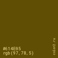 Цвет #614E05 в цветовой модели RGB обозначается тремя октетами (97, 78, 5) в десятичном формате и #614E05 в шестнадцатиричном (hex) формате, которые являются интенсивностью красного 97 (hex 61), интенсивность зелёного 78 (hex 4E) и интенсивность синего 5 (hex 05).