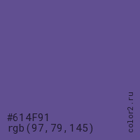 Цвет #614F91 в цветовой модели RGB обозначается тремя октетами (97, 79, 145) в десятичном формате и #614F91 в шестнадцатиричном (hex) формате, которые являются интенсивностью красного 97 (hex 61), интенсивность зелёного 79 (hex 4F) и интенсивность синего 145 (hex 91).