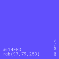 Цвет #614FFD в цветовой модели RGB обозначается тремя октетами (97, 79, 253) в десятичном формате и #614FFD в шестнадцатиричном (hex) формате, которые являются интенсивностью красного 97 (hex 61), интенсивность зелёного 79 (hex 4F) и интенсивность синего 253 (hex FD).