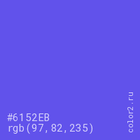 Цвет #6152EB в цветовой модели RGB обозначается тремя октетами (97, 82, 235) в десятичном формате и #6152EB в шестнадцатиричном (hex) формате, которые являются интенсивностью красного 97 (hex 61), интенсивность зелёного 82 (hex 52) и интенсивность синего 235 (hex EB).