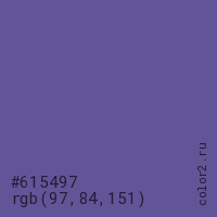 Цвет #615497 в цветовой модели RGB обозначается тремя октетами (97, 84, 151) в десятичном формате и #615497 в шестнадцатиричном (hex) формате, которые являются интенсивностью красного 97 (hex 61), интенсивность зелёного 84 (hex 54) и интенсивность синего 151 (hex 97).