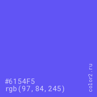 Цвет #6154F5 в цветовой модели RGB обозначается тремя октетами (97, 84, 245) в десятичном формате и #6154F5 в шестнадцатиричном (hex) формате, которые являются интенсивностью красного 97 (hex 61), интенсивность зелёного 84 (hex 54) и интенсивность синего 245 (hex F5).
