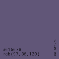 Цвет #615678 в цветовой модели RGB обозначается тремя октетами (97, 86, 120) в десятичном формате и #615678 в шестнадцатиричном (hex) формате, которые являются интенсивностью красного 97 (hex 61), интенсивность зелёного 86 (hex 56) и интенсивность синего 120 (hex 78).