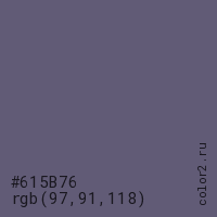 Цвет #615B76 в цветовой модели RGB обозначается тремя октетами (97, 91, 118) в десятичном формате и #615B76 в шестнадцатиричном (hex) формате, которые являются интенсивностью красного 97 (hex 61), интенсивность зелёного 91 (hex 5B) и интенсивность синего 118 (hex 76).
