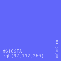 Цвет #6166FA в цветовой модели RGB обозначается тремя октетами (97, 102, 250) в десятичном формате и #6166FA в шестнадцатиричном (hex) формате, которые являются интенсивностью красного 97 (hex 61), интенсивность зелёного 102 (hex 66) и интенсивность синего 250 (hex FA).