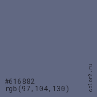 Цвет #616882 в цветовой модели RGB обозначается тремя октетами (97, 104, 130) в десятичном формате и #616882 в шестнадцатиричном (hex) формате, которые являются интенсивностью красного 97 (hex 61), интенсивность зелёного 104 (hex 68) и интенсивность синего 130 (hex 82).