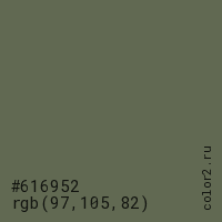 Цвет #616952 в цветовой модели RGB обозначается тремя октетами (97, 105, 82) в десятичном формате и #616952 в шестнадцатиричном (hex) формате, которые являются интенсивностью красного 97 (hex 61), интенсивность зелёного 105 (hex 69) и интенсивность синего 82 (hex 52).