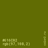 Цвет #616C02 в цветовой модели RGB обозначается тремя октетами (97, 108, 2) в десятичном формате и #616C02 в шестнадцатиричном (hex) формате, которые являются интенсивностью красного 97 (hex 61), интенсивность зелёного 108 (hex 6C) и интенсивность синего 2 (hex 02).