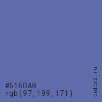 Цвет #616DAB в цветовой модели RGB обозначается тремя октетами (97, 109, 171) в десятичном формате и #616DAB в шестнадцатиричном (hex) формате, которые являются интенсивностью красного 97 (hex 61), интенсивность зелёного 109 (hex 6D) и интенсивность синего 171 (hex AB).